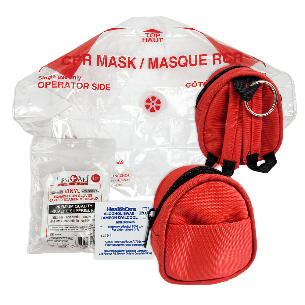 [1] Masque RCR à utilisation unique avec filtre, [1] Paire de gants d'examen en vinyle, [1] Tampon antiseptique alcoolisé, [1] Sac réutilisable en nylon.